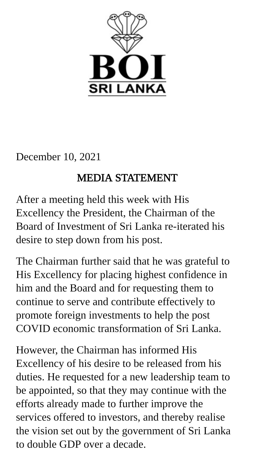 முதலீட்டுச் சபையின் தலைவர் சஞ்சய மொஹொத்தல தனது பதவியை இராஜிநாமா செய்துள்ளார்.